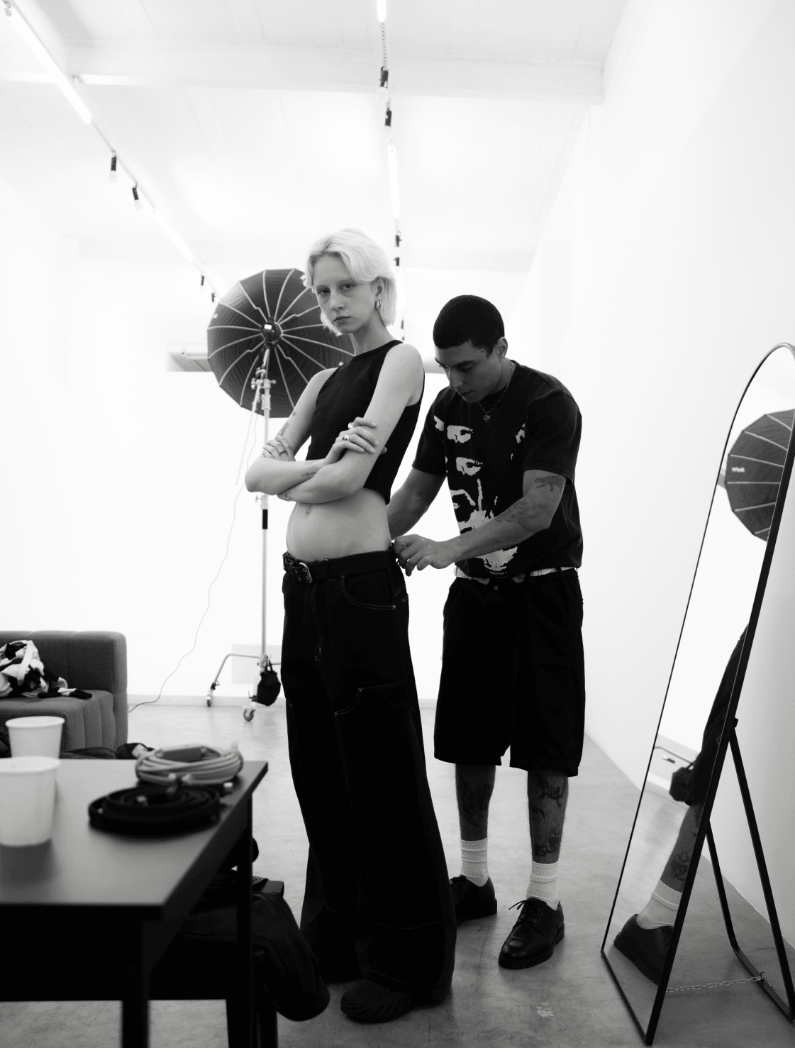 Espaço versátil do Studio Luah com estética industrial inglesa, 6m de pé direito e iluminação natural, ideal para produções de foto e vídeo ou como área de apoio para equipes durante shootings e campanhas.