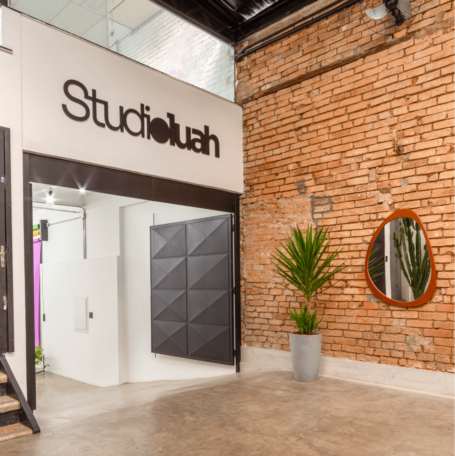 O galpão do Studio Luah é um espaço versátil para locação de fotos, vídeos e produção de conteúdo em São Paulo, com 70m² de área total e 6 metros de pé direito. Decorado no estilo industrial inglês, o ambiente possui paredes de tijolo aparente, tubulações aparentes, portas metálicas pretas, luminárias e mobiliário cuidadosamente selecionado, criando um cenário autêntico e altamente instagramável para produções fotográficas e audiovisuais.